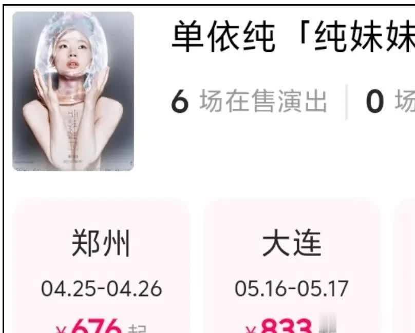 2026年4月25日,本应是单依纯郑州演唱会开唱之日。场馆外,氛围略显微妙。在几个主要的票务交易平台上,这场演出的门票价格出现了罕见的大幅下滑。官方定价分六个档次,从380元至1880元。然而在演出临近时,原价1880元的内场票,部分卖家挂出的价格已跌破千元;1580元档位的票,七八百元就能买到;就连1280元 的看台票,也出现了三折左右的报价。