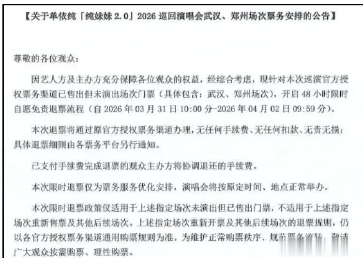 这种恐慌与观望并非毫无缘由。就在票价跳水的郑州场开演前不到一个月,主办方为包括郑州在内的多个场次,开启了一个为期48小时的“自愿免责退票通道”。这个在演唱会行业极为少见的举动,直接将所有人的记忆拉回到了2026年3月底那场席卷社交网络的风波。